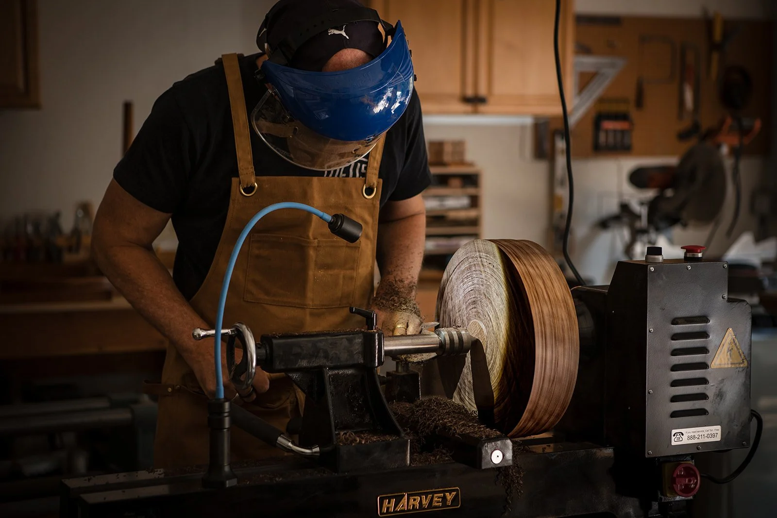 Later, Rob stepped out to the woodworking workshop where he spends some of his downtime. The space reflects the same creative curiosity that runs through their home—tools, wood shavings, and the quiet focus of someone working with their hands.